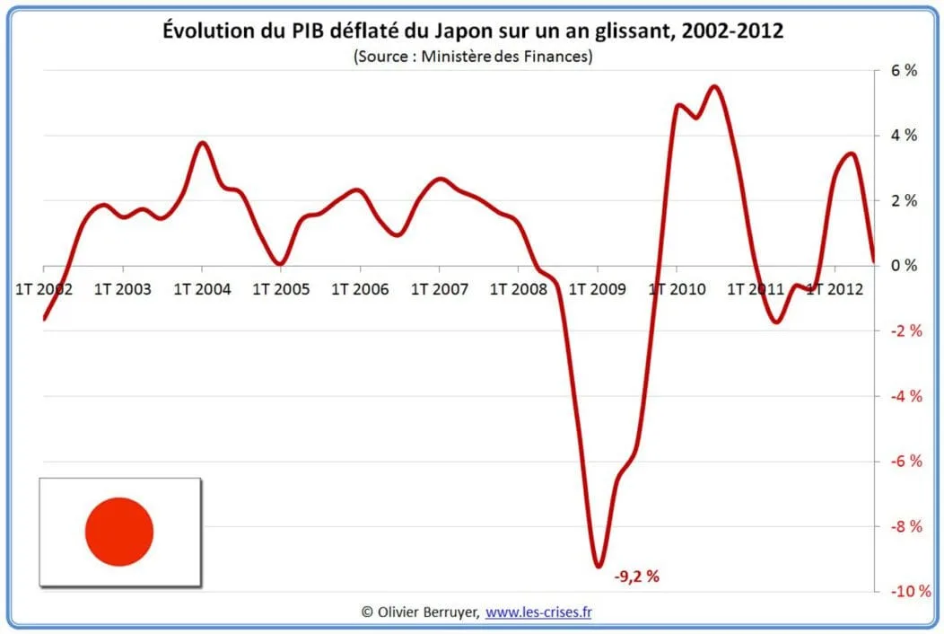 En 1991, la débâcle de la bulle spéculative au Japon a entraîné une longue période de stagnation économique, décrite comme la « décennie perdue ». Le PIB a chuté de manière significative en valeur réelle tout au long des années 1990. Pour y remédier, la Banque du Japon a entrepris, au début des années 2000, d’encourager la croissance économique par une politique non traditionnelle d’assouplissement quantitatif. La dette publique japonaise dépassait en 2013 un quadrillion de yens (10,46 trillions de dollars américains), soit environ deux fois le produit intérieur brut annuel du pays à l’époque, et déjà le plus grand ratio d’endettement de toutes les nations.